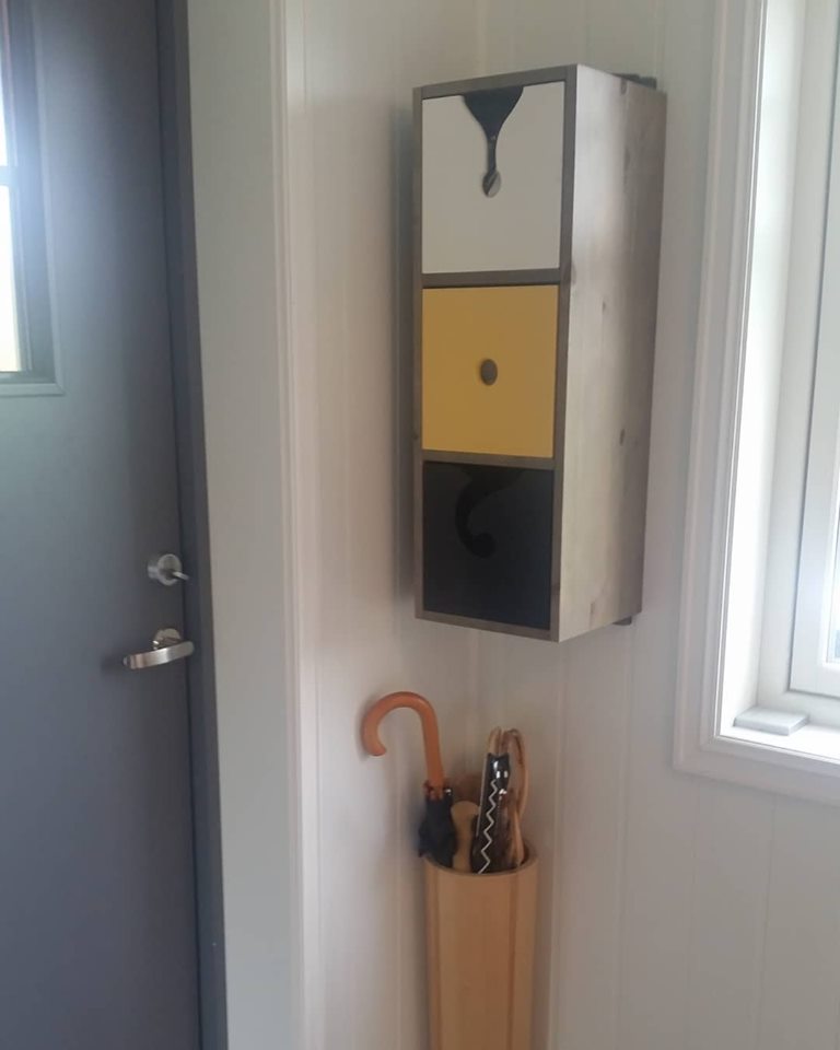 Fyll det med hansker, votter og skjerf (helst strikkede selvsagt) og du har et plasseringsvennlig entrémøbel, som passer like godt på hytta som hjemme.